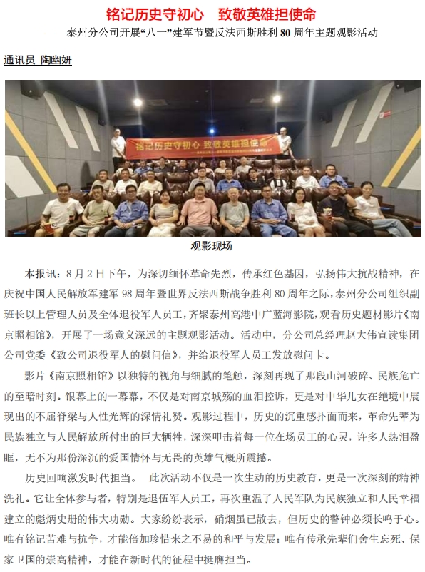 泰州分公司開展“八一”建軍節(jié)暨反法西斯勝利80周年主題觀影活動(dòng)